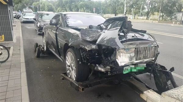 此前10月3日,一辆劳斯莱斯闪灵轿车停在公路上,车身损毁严重,安全气囊弹出。从现场照片看,这辆挂着京A牌照的闪灵车头已经面目全非,严重凹陷,车内气囊弹出,损失惨重,而它所处的位置正好为逆行。